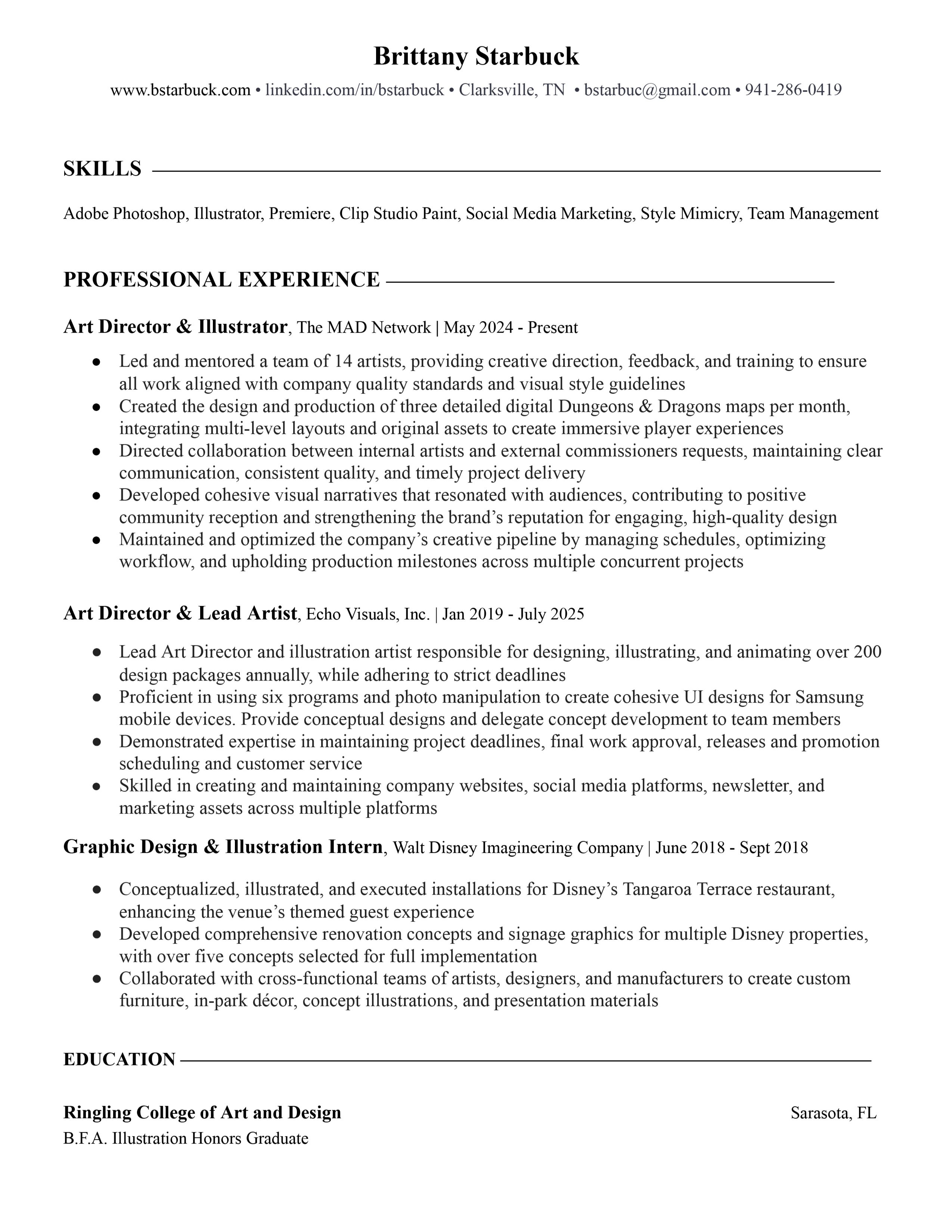 Versatile and highly skilled in both traditional and digital media, Brittany Starbuck brings 7 years of extensive experience in illustration, graphic design, and animation, with a strong background in leading creative teams and executing large-scale visual projects.
