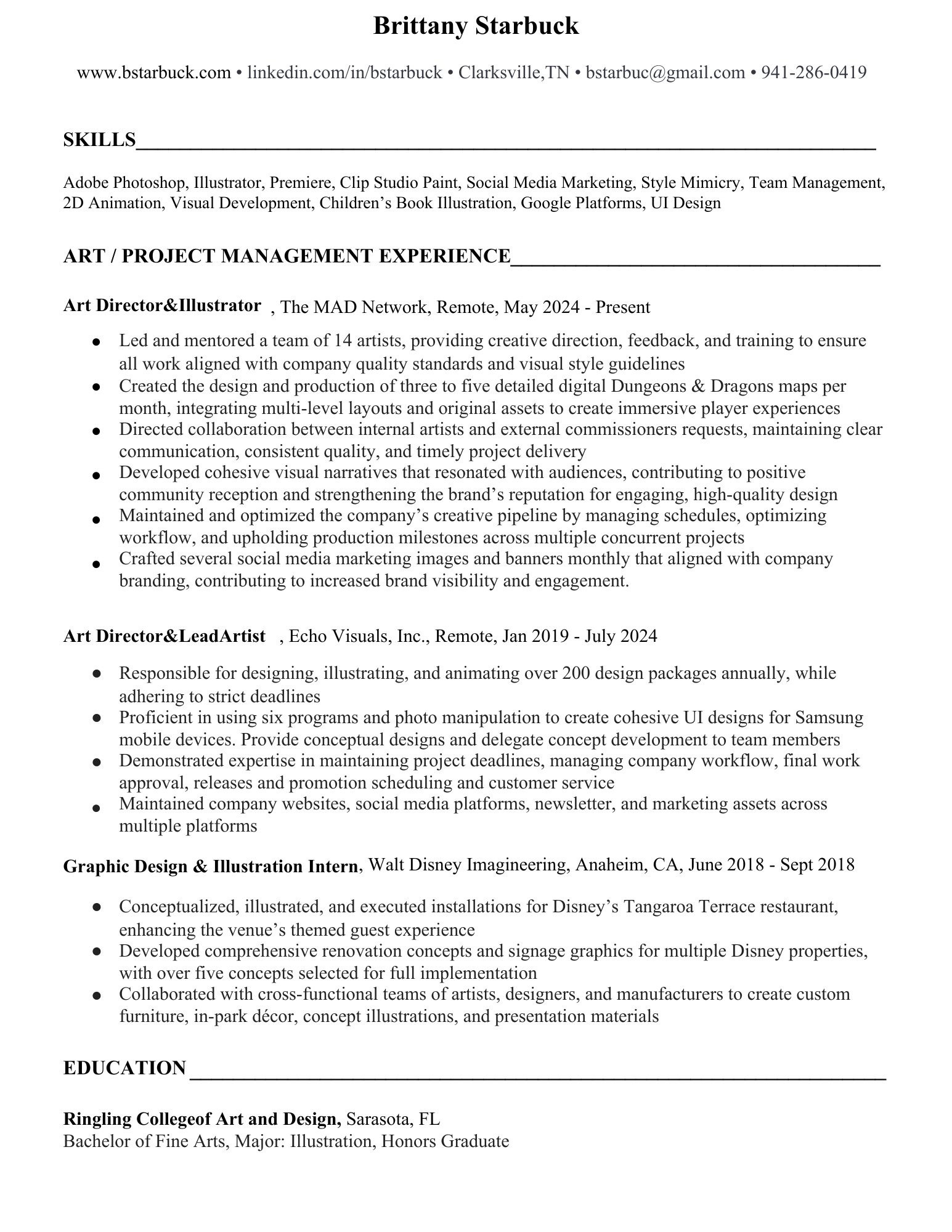Versatile and highly skilled in both traditional and digital media, Brittany Starbuck brings 7 years of extensive experience in illustration, graphic design, and animation, with a strong background in leading creative teams and executing large-scale visual projects.